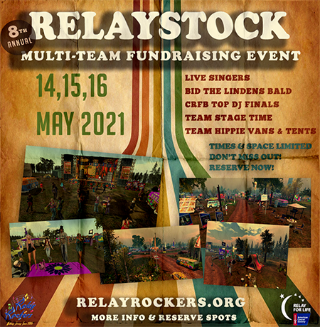 Relay For Life of Second Life is the largest virtual event in the world and 2020 was ranked 5th among more than 5000 Relay for Life events. Since 2004, Relay for Life of SL has raised more than ONE BILLION LINDENS. THAT’S MORE THAN $4 MILLION DOLLARS in support of the American Cancer Society.